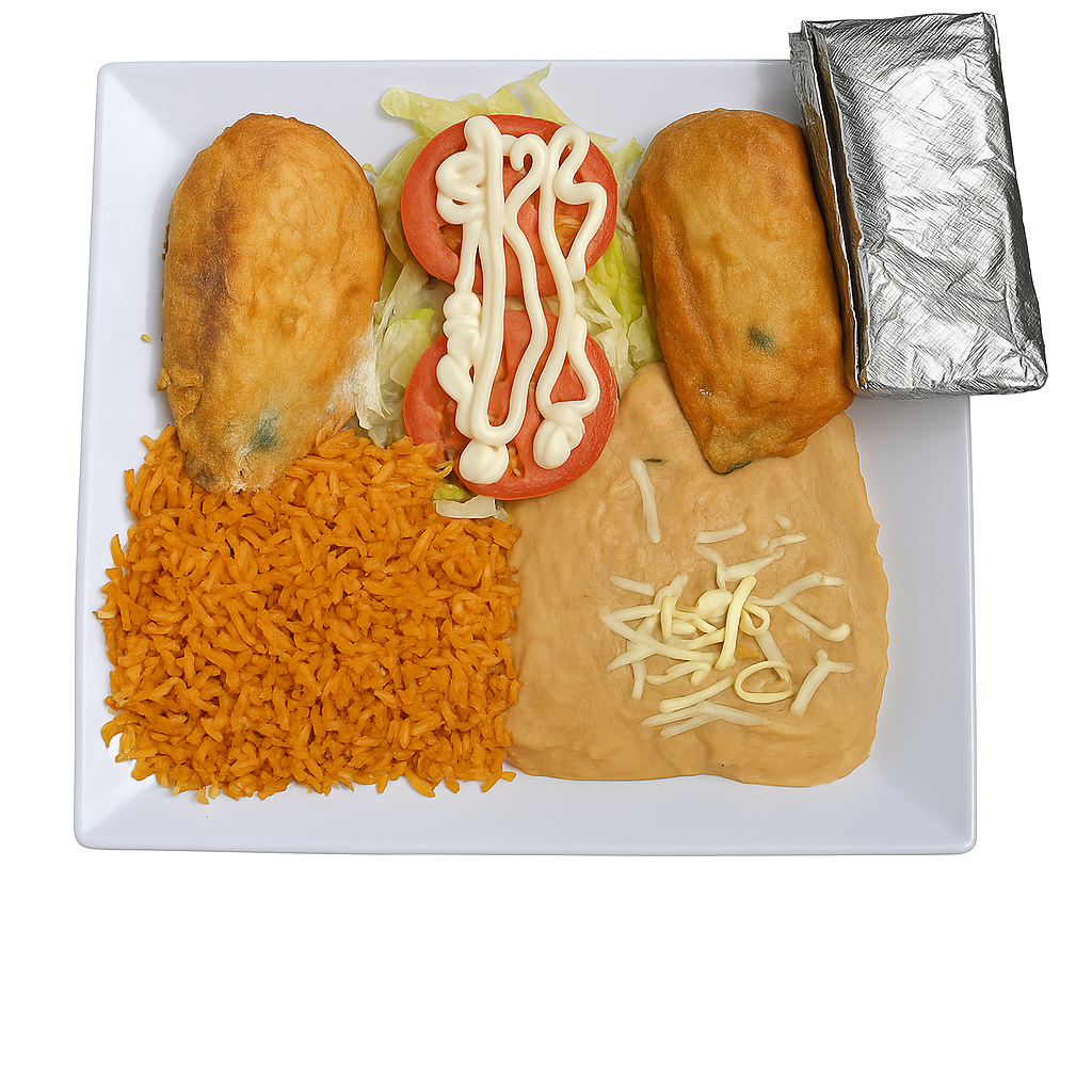 2 stuffed poblano peppers Served with rice, beans, salad and tortillas.
