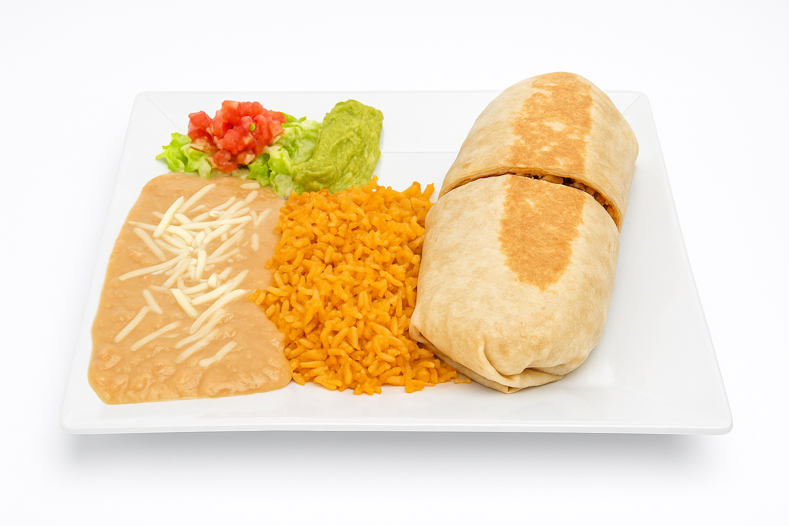 With beans, rice, meat, cheese, tomato,lettuce, sour cream and guacamole