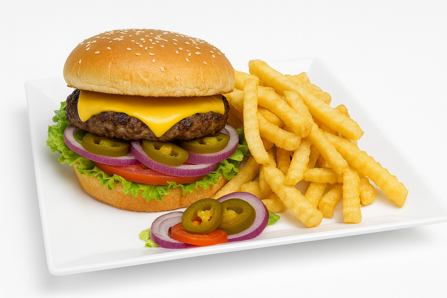 Includes French Fries with cheese, lettuce, tomato, onion and jalapeños