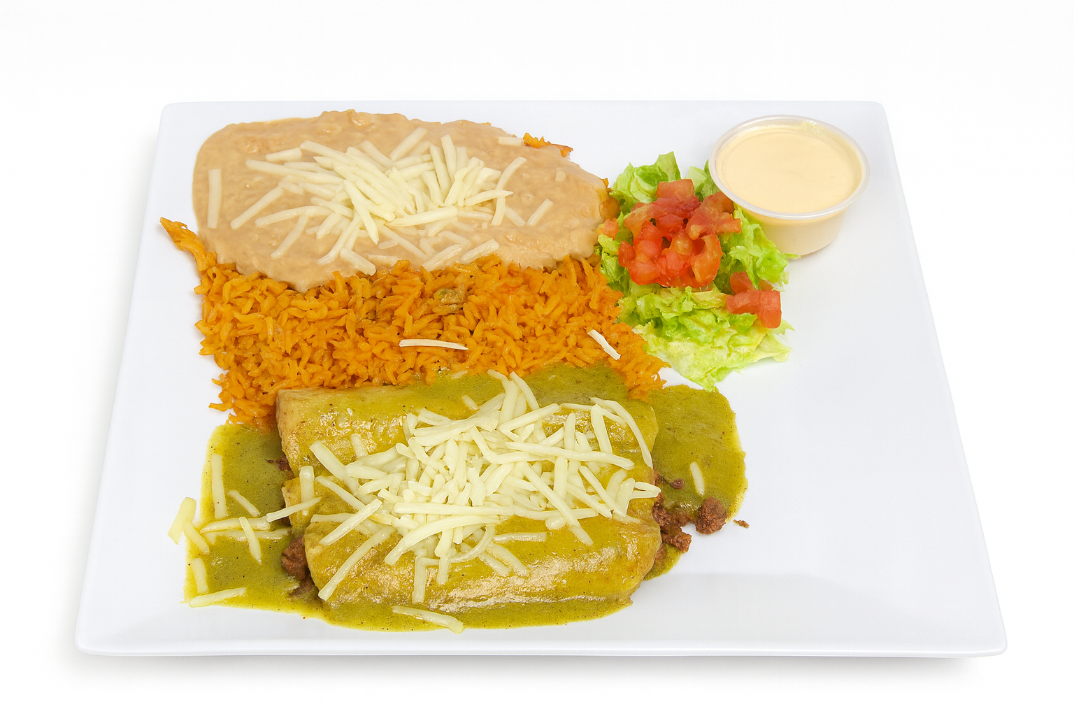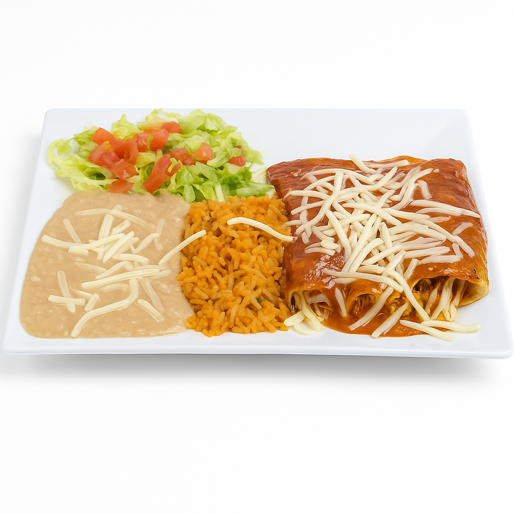Served with: Rice, beans, salad and tortillas