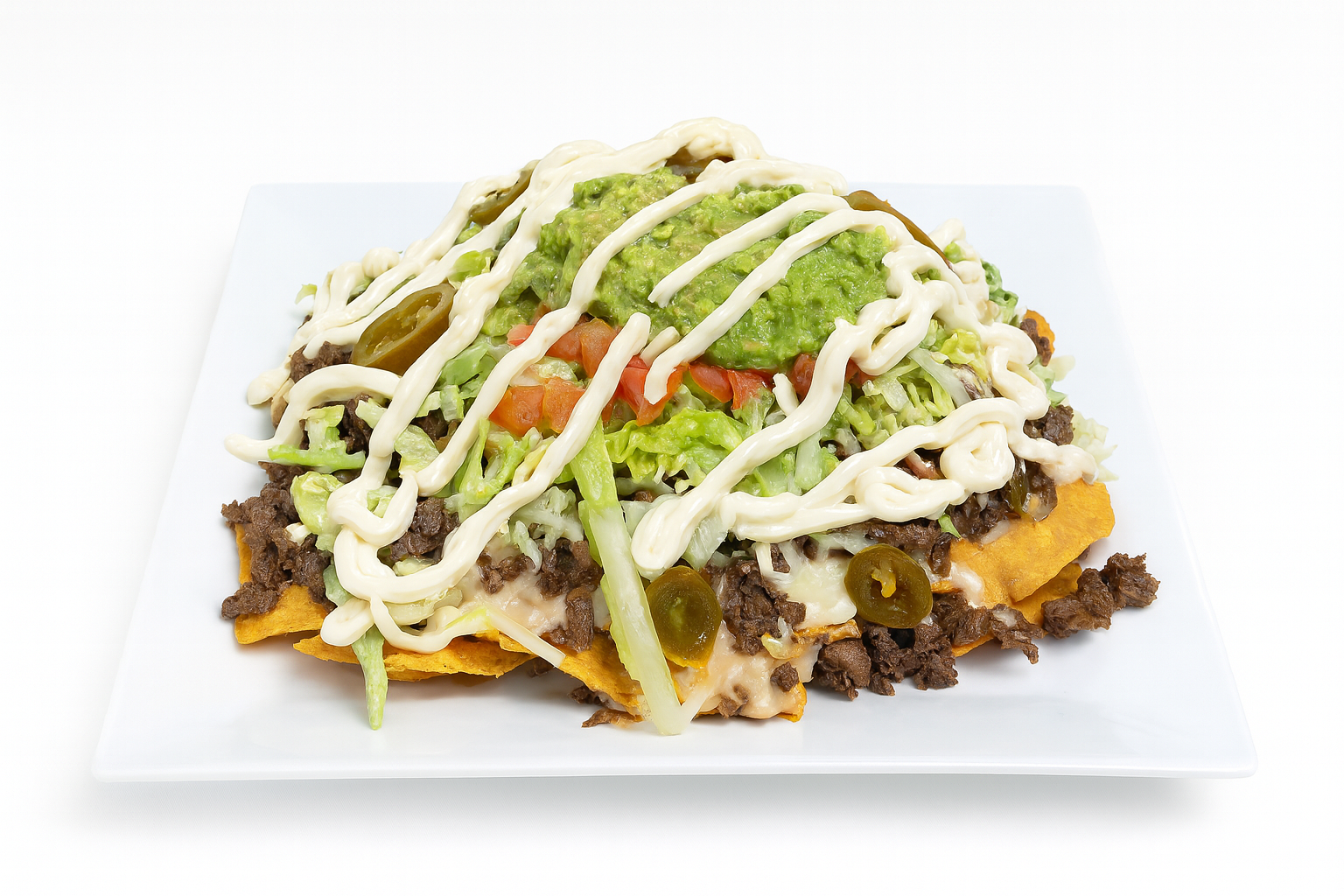 Includes: Beans, Chips, Lettuce, Cheese Dip, Tomato, Jalapeño, Sour Cream, Shredded Cheese and guacamole.