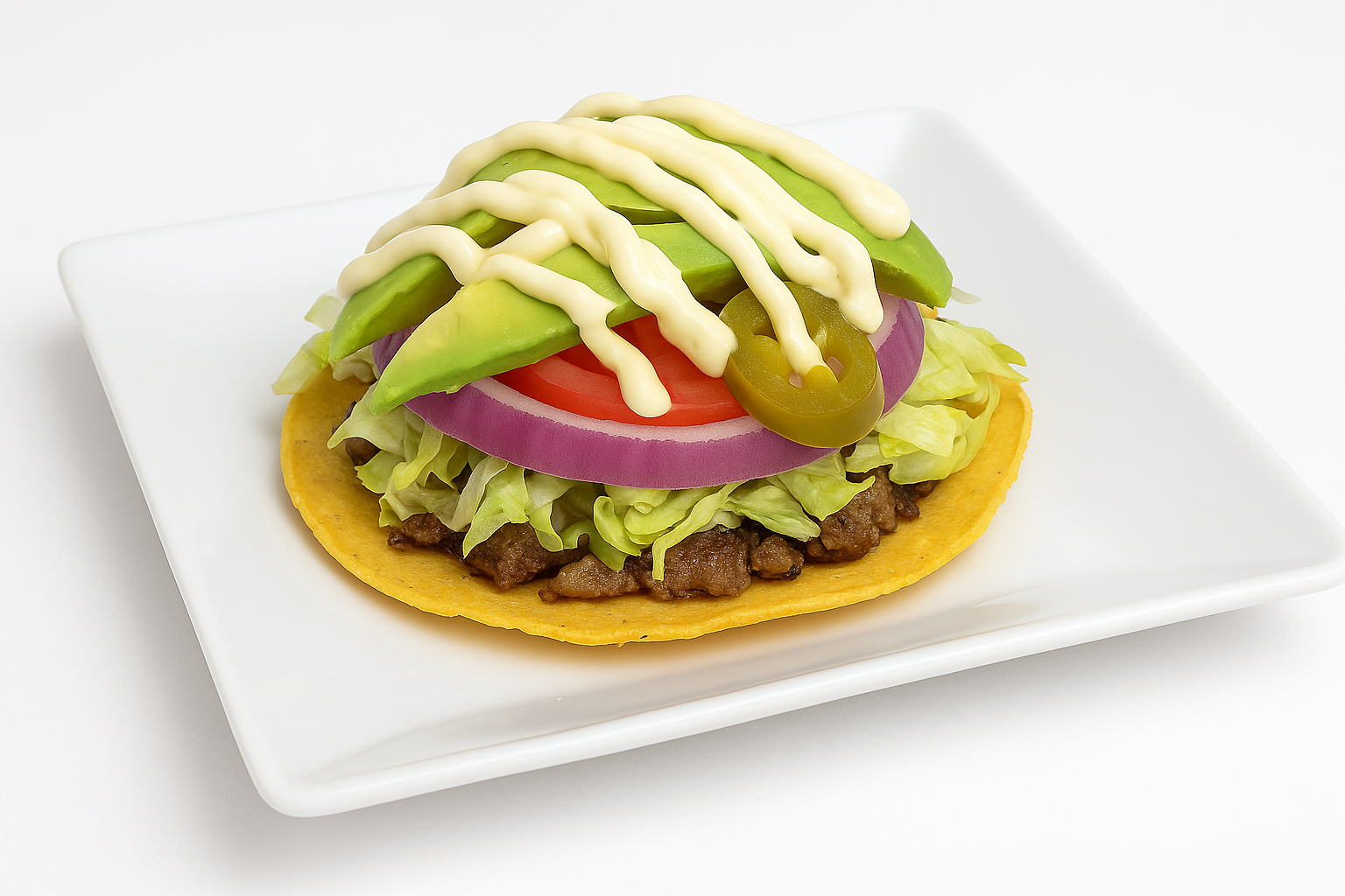 With beans, meat, lettuce, tomato, cheese, onion, jalapeño, sour cream and avocado